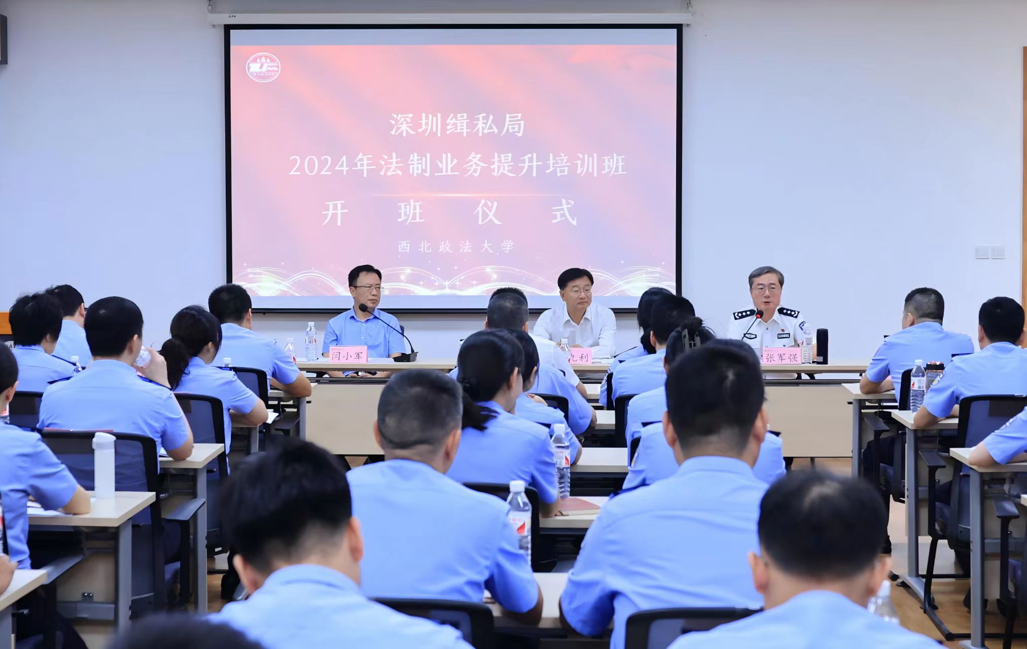 张军强局长作开班动员讲话,对全体参训学员提出要求,一是厚植法治精神,延续家国情怀;二是提升执法能力,守卫国门安全;三是深化交流学习,拓展合作平台。他指出,此次培训能够顺利举行,得益于校方的大力支持,希望能以此次培训为契机,建立多方交流、共同合作机制,搭建与政法大学等专业院校开展专业培训、实践教学的双向交流平台。