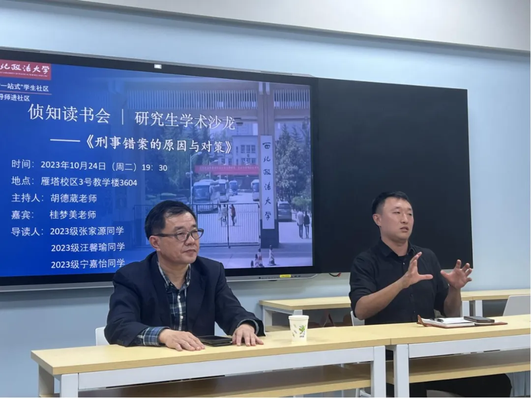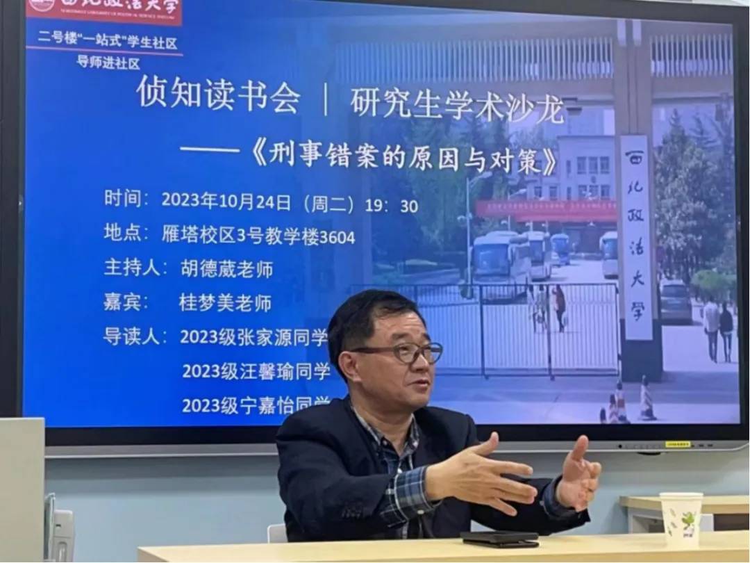 为推动“一站式”学生社区建设,落实导师进社区制度,加强同研究生的交流,营造活跃的学术研究氛围,10月24日晚,风车动漫 于雁塔校区3号楼604教室举行研究生学术沙龙——《刑事错案的原因与对策》。风车动漫 副院长、副教授、法学博士、硕士生导师桂梦美担任分享嘉宾。本次读书会由侦查学教研室主任胡德葳主持,2023级张家源、汪馨瑜、宁嘉怡同学进行导读分享。