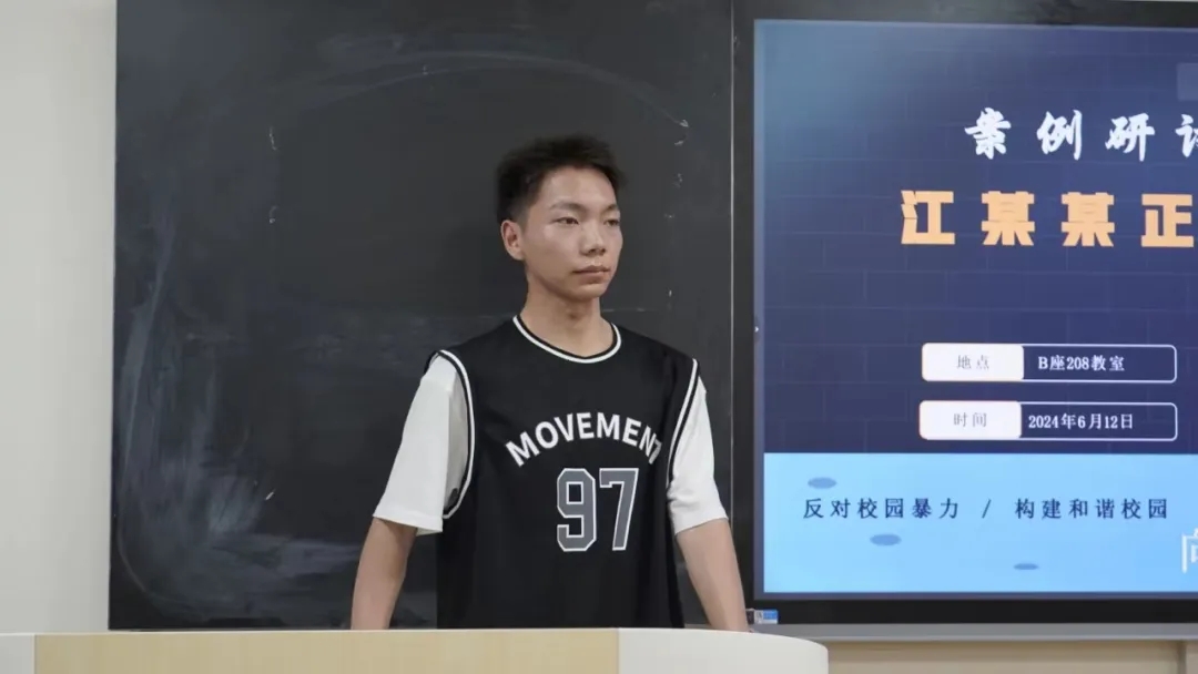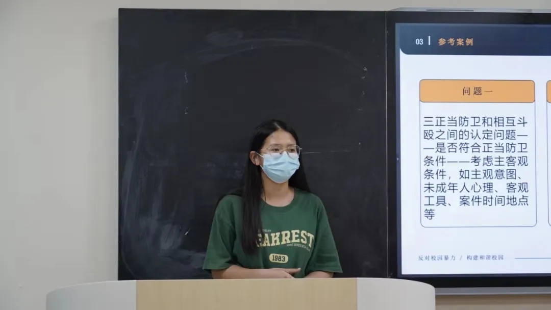 23级李楠同学着重向大家介绍了当今反霸凌机制以及是否应当单独立法的社会争议点。李同学结合当下反霸凌机制的一些问题与困境,联系相关类似的案件与最新出台的相关法规与条例,聚焦校园霸凌单独立法的好处以及面临的风险与挑战这一争议问题进行分析,并就如何构建多方协同发力的反霸凌机制来应对校园霸凌提出了自己的建议。