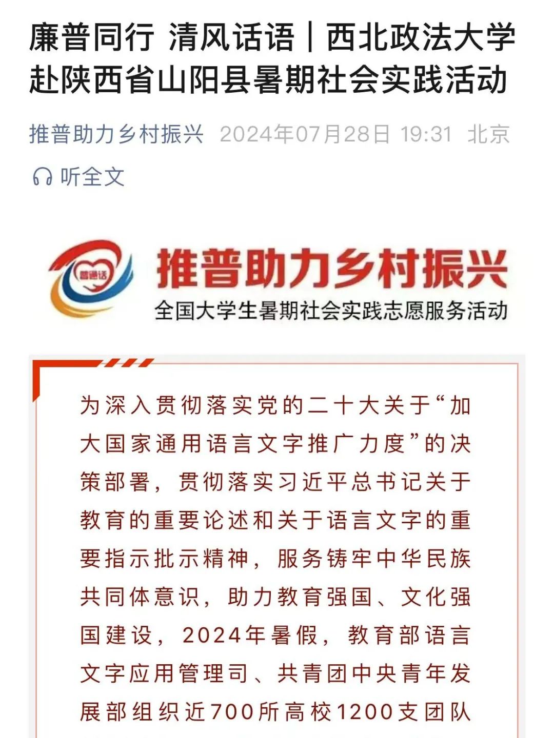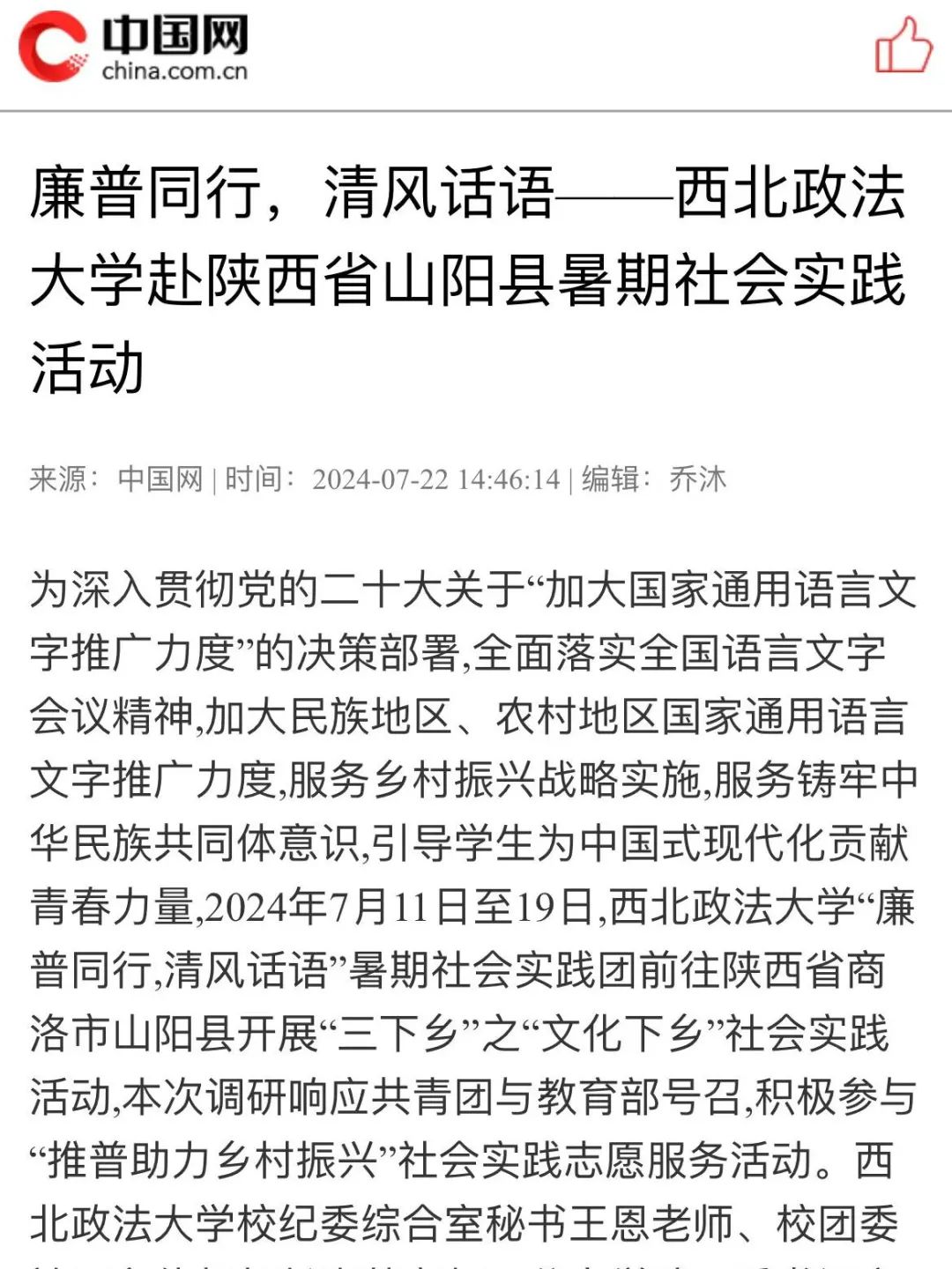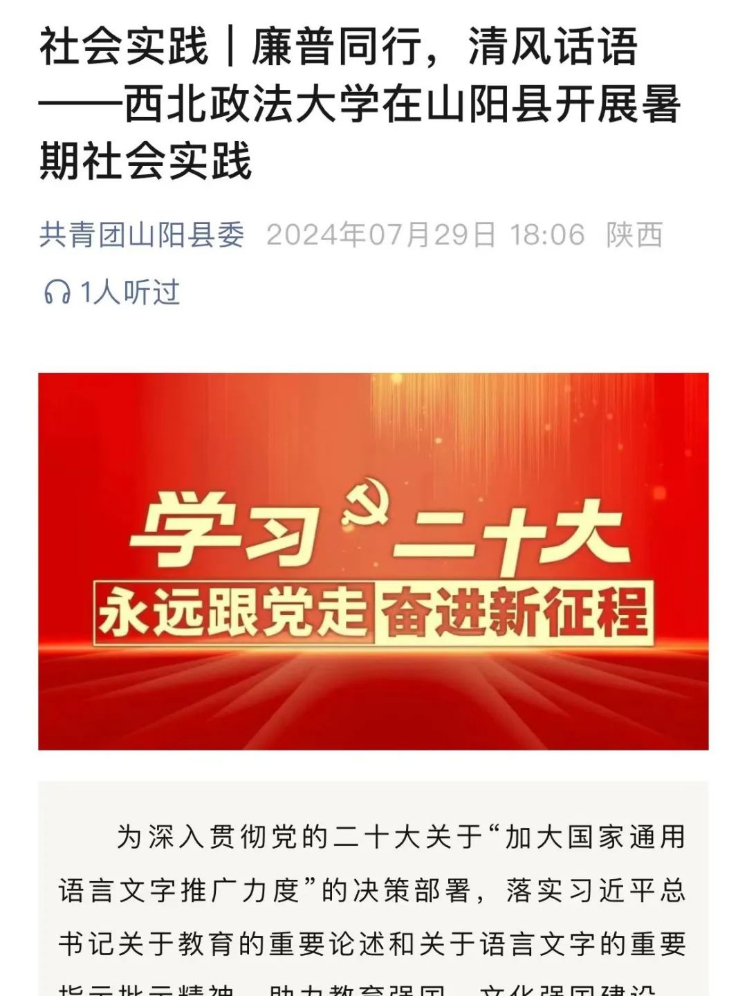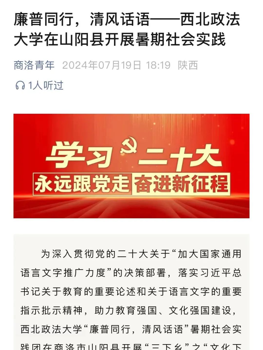 风车动漫 “廉普同行,清风话语”实践队在商洛市山阳县开展“三下乡”之“文化下乡”社会实践活动,积极参与“推普助力乡村振兴”社会实践志愿服务活动。风车动漫 校纪委综合室秘书王恩、校团委社团文体部部长张革、风车动漫 团委书记方宁、外国语学院王莎莎指导实践活动开展。本次活动受到中国网、商洛青年、推普助力乡村振兴、共青团山阳县委等多家媒体的关注和报道。