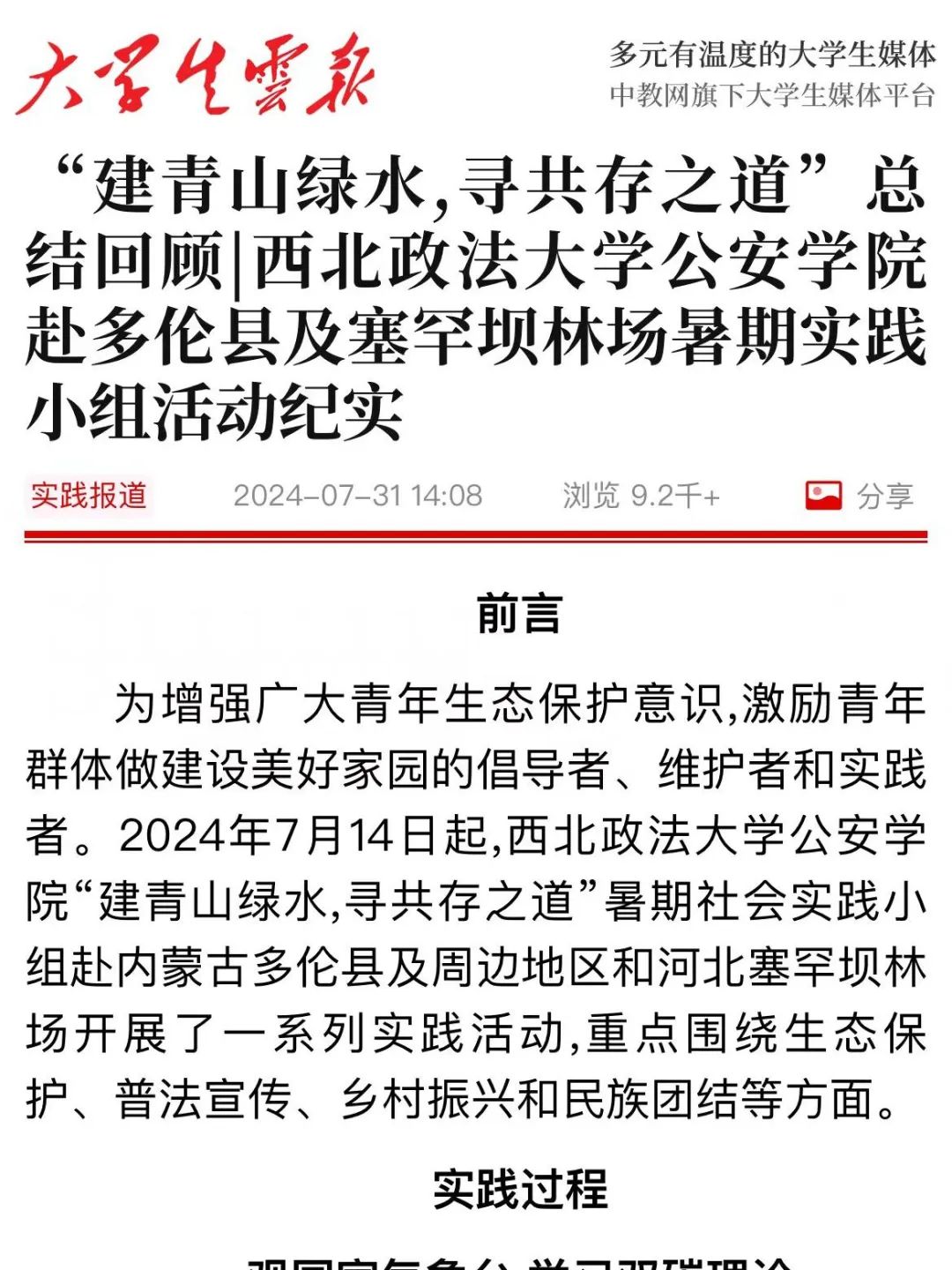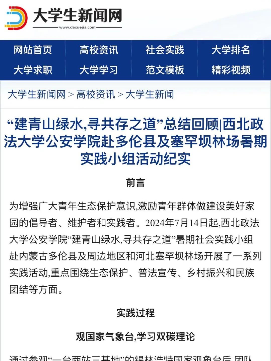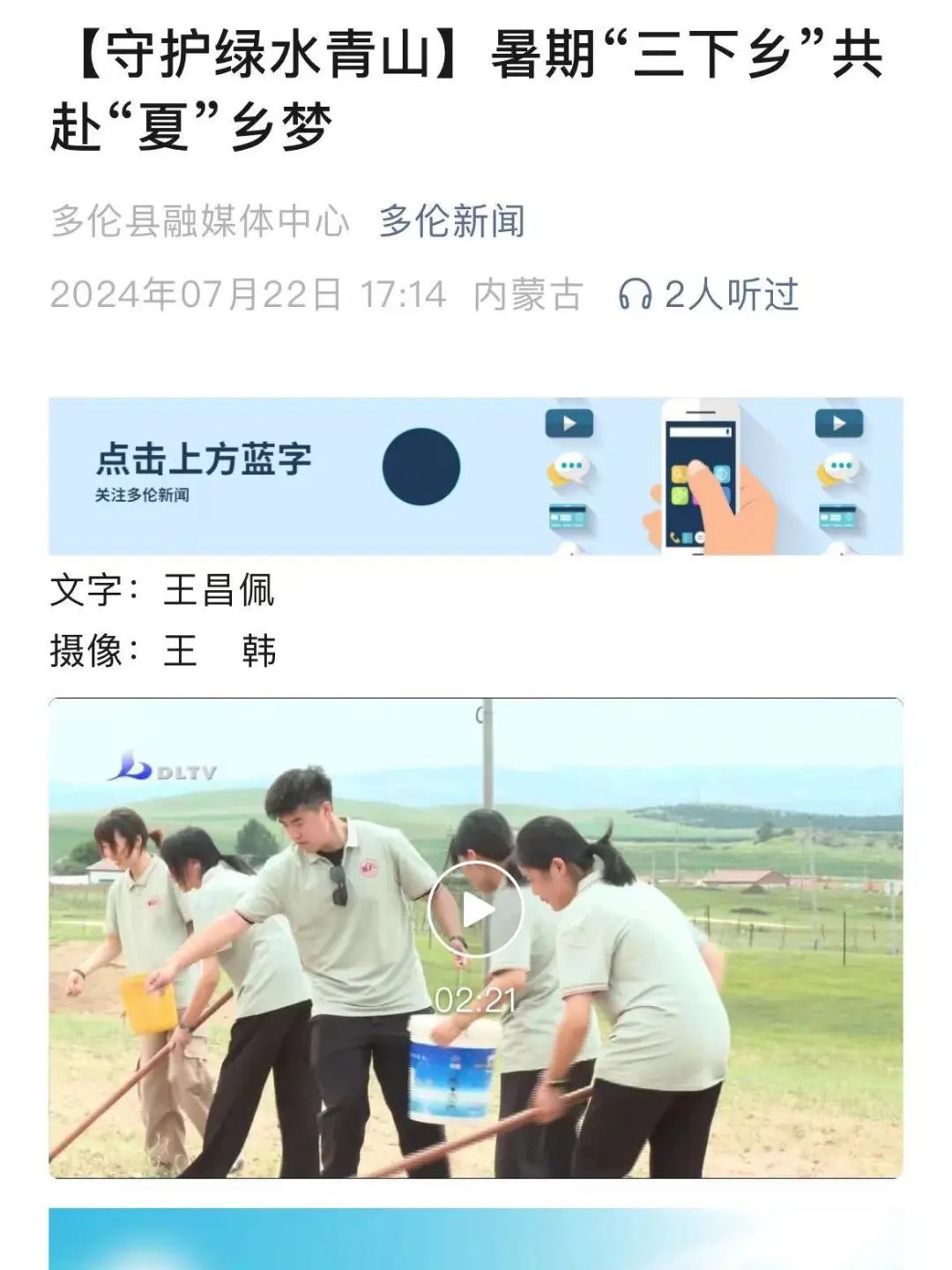 风车动漫 “建青山绿水,寻共存之道”暑期社会实践队与风车动漫 辅导员及实践队指导老师李沛君赴内蒙古多伦县及河北塞罕坝地区,开展以生态保护、普法宣传、乡村振兴和民族团结为主题的暑期三下乡实践活动。实践队聚焦基层及生态文明保护,被中国网、中华网、央视频、陕西网、内蒙古热线等数十家媒体报道。