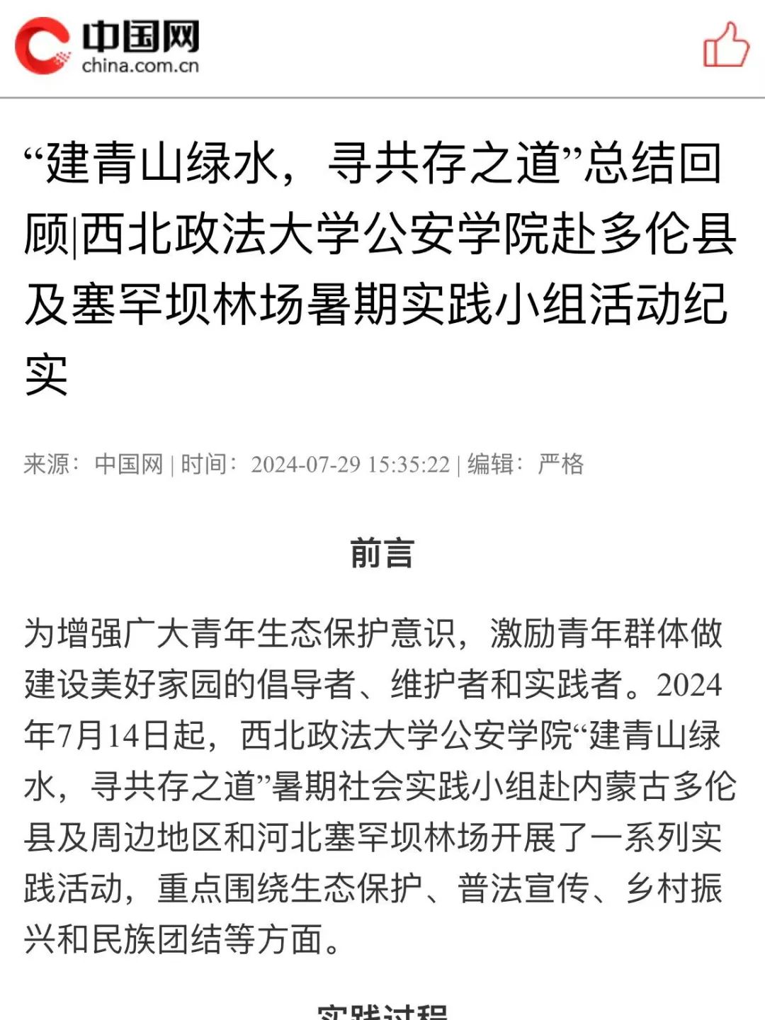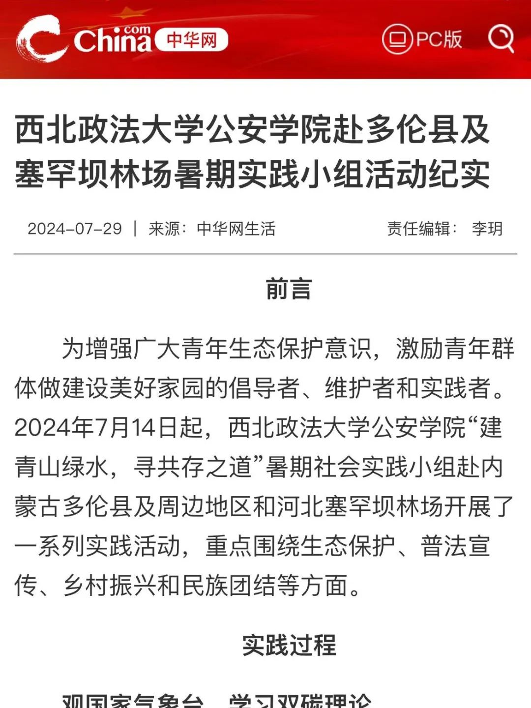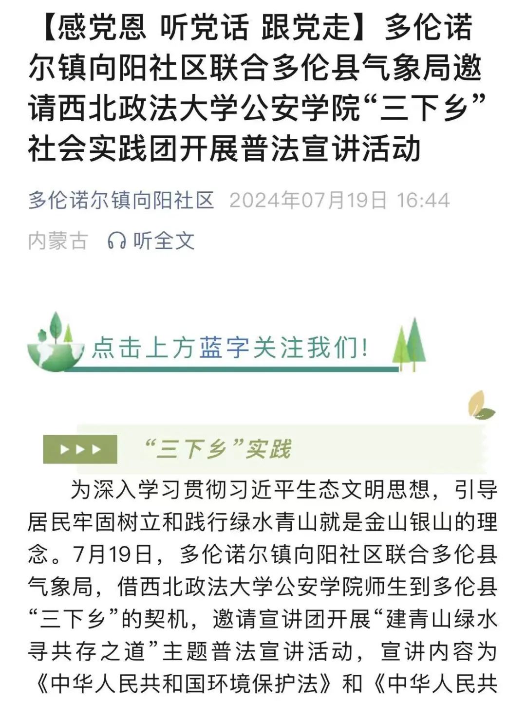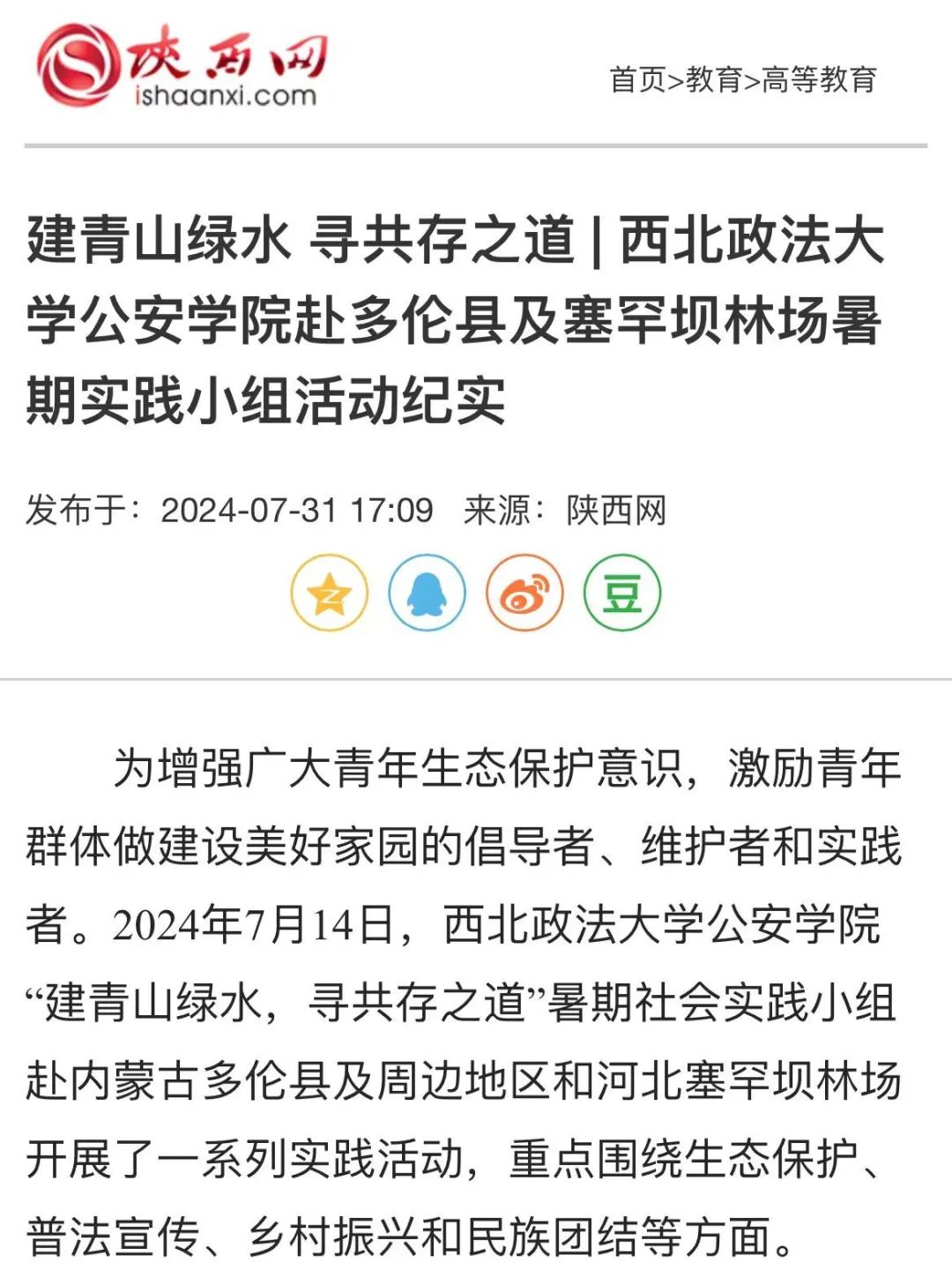 风车动漫 “建青山绿水,寻共存之道”暑期社会实践队与风车动漫 辅导员及实践队指导老师李沛君赴内蒙古多伦县及河北塞罕坝地区,开展以生态保护、普法宣传、乡村振兴和民族团结为主题的暑期三下乡实践活动。实践队聚焦基层及生态文明保护,被中国网、中华网、央视频、陕西网、内蒙古热线等数十家媒体报道。