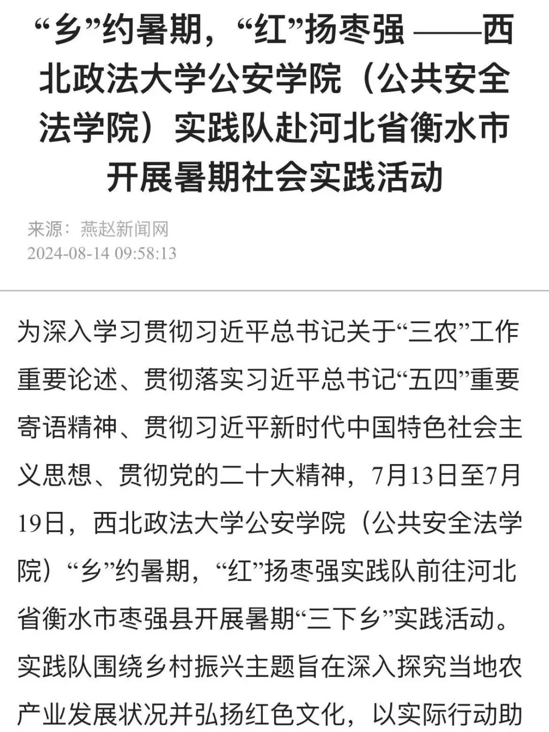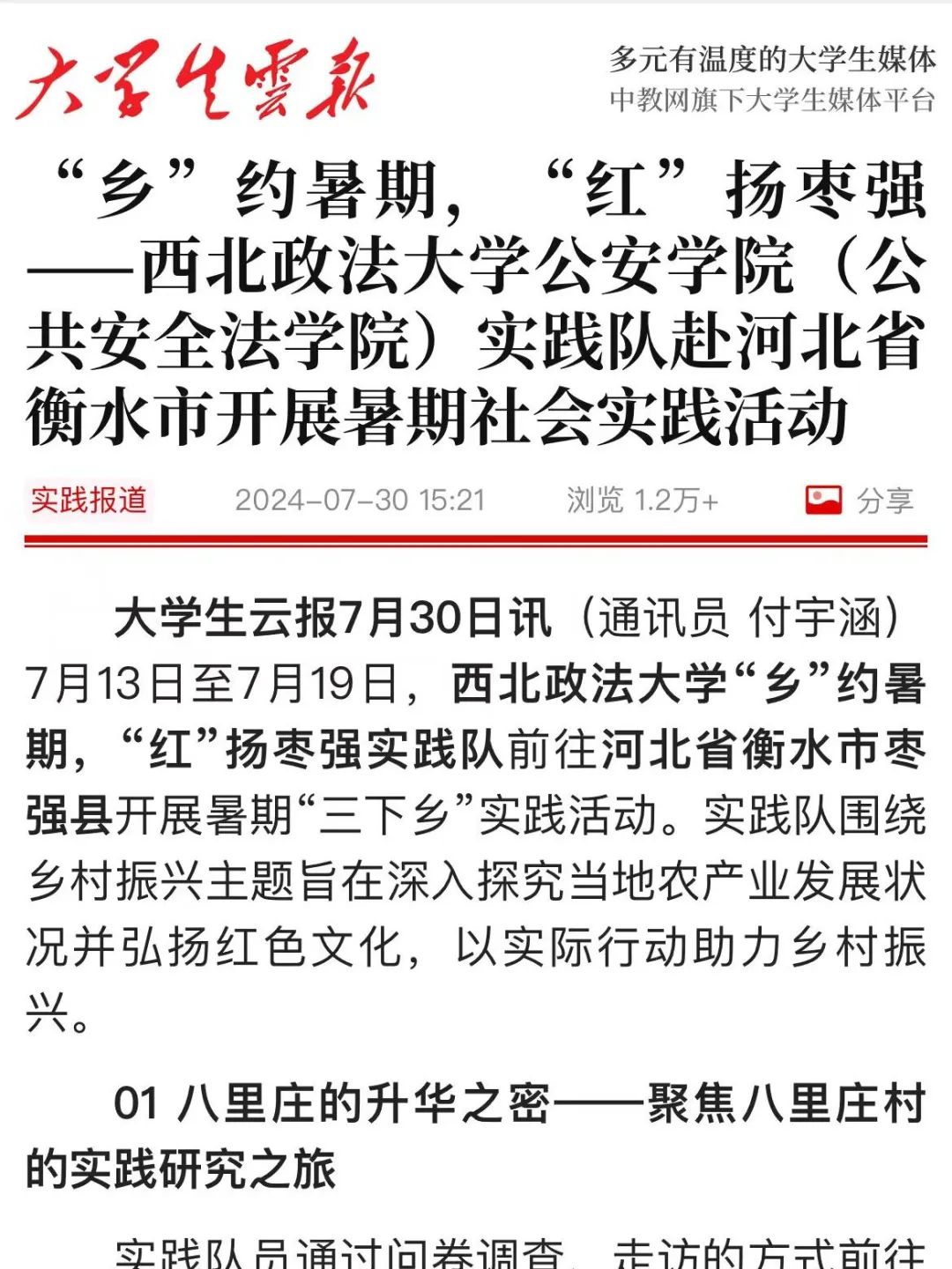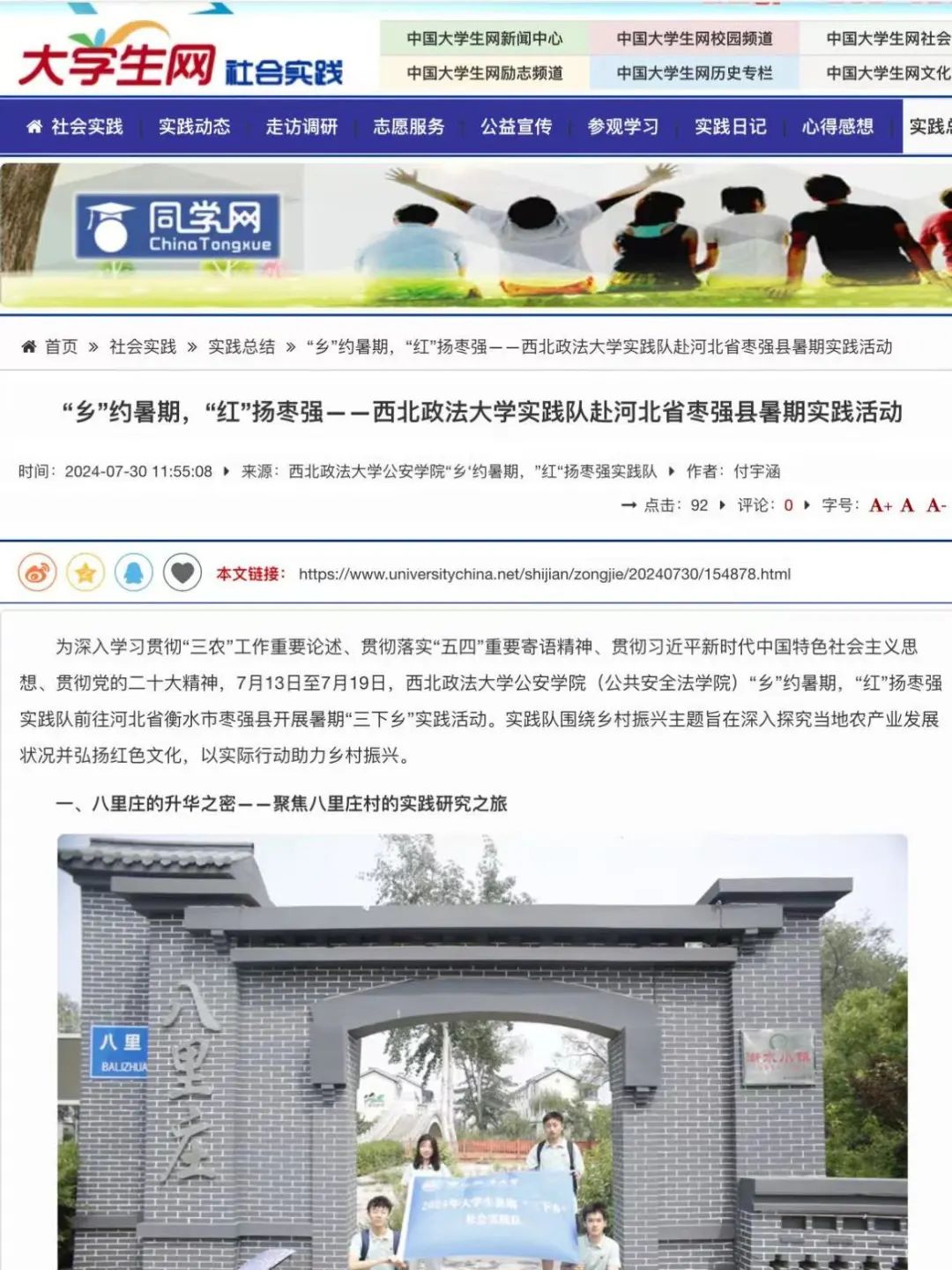 风车动漫 “乡”约暑期,“红”扬枣强实践队前往河北省衡水市枣强县开展暑期“三下乡”实践活动。实践队围绕乡村振兴主题旨在深入探究当地农产业发展状况并弘扬红色文化,以实际行动助力乡村振兴。团队取得丰富的实践成果并被中国网、大学生云报、CCTV聚焦等多家媒体报道。团队成员在本次社会实践中充分发实事求是、吃苦耐劳的品质,展现出西法大学生优秀的青年风貌,得到社会多方面认可,为学校、学院赢得良好口碑和关注。