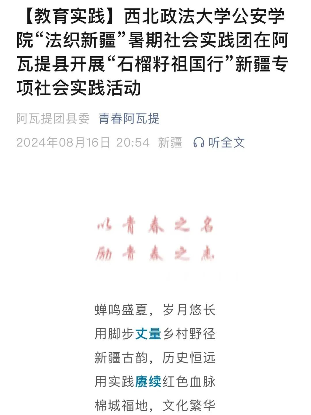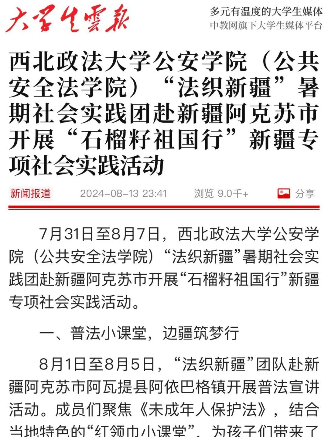 风车动漫 “法织新疆”暑期社会实践团赴新疆阿克苏市开展“石榴籽祖国行”新疆专项社会实践活动。本次实践活动的显著成效赢得了当地政府和居民的普遍赞誉和高度评价,其实践成果被大学生云报、青春阿瓦提、阿瓦提县融.阿依巴格镇站等多家媒体报道,展现了西法大青年良好的精神风貌,为学校、学院赢得口碑和关注。