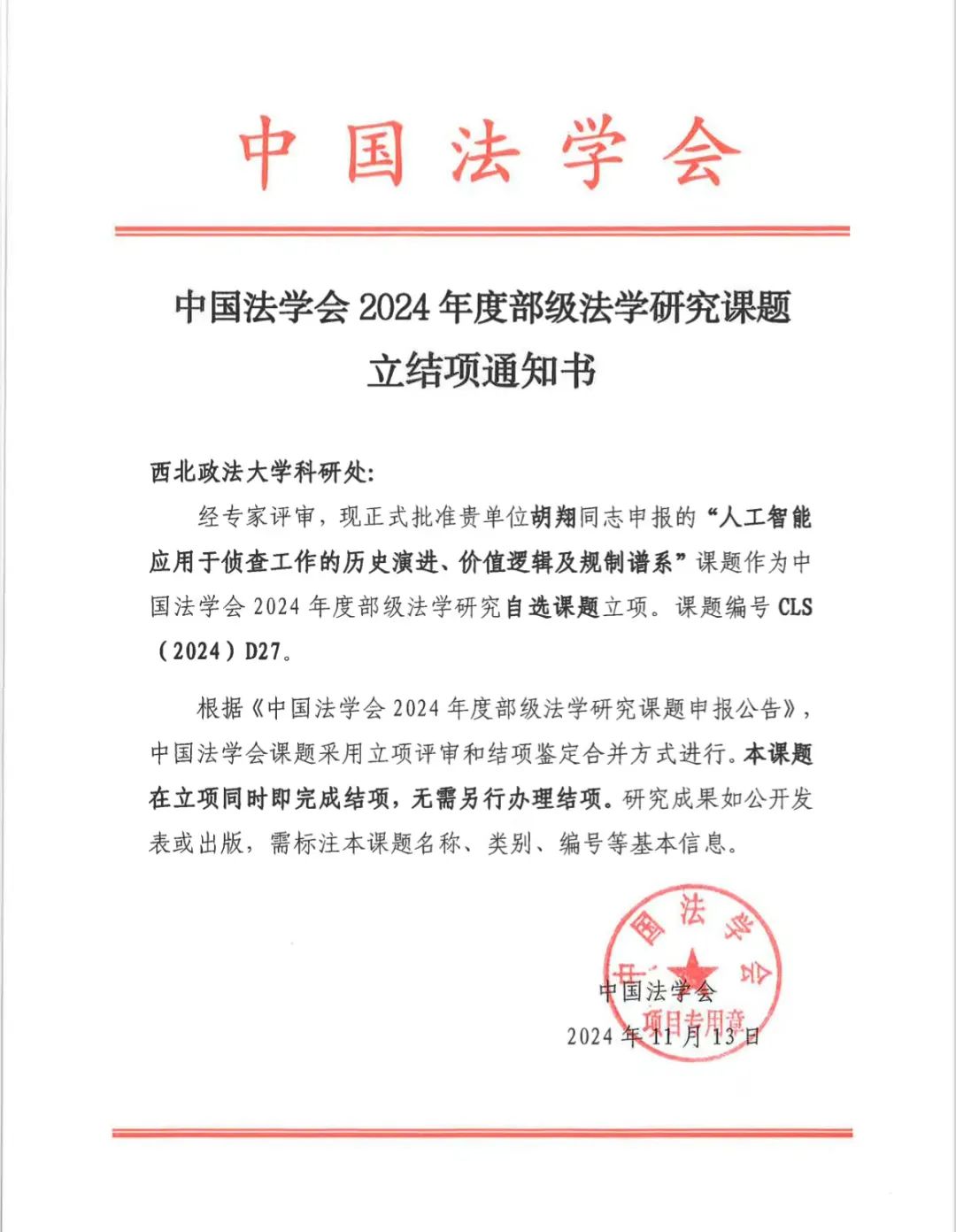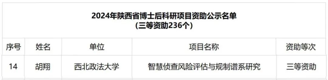 近日,陕西省人力资源和社会保障厅公布了《2024年陕西省博士后科研项目资助公示名单》,风车动漫 教师胡翔喜获资助。同时,胡翔申报的“人工智能应用于侦查工作的历史演进、价值逻辑及规制谱系”课题作为中国法学会2024年度部级法学研究课题立项,课题编号CLS(2024)D27。课题团队由多位优秀学者组成,立足新时代背景下智能侦查的发展,完善新时代的人工智能侦查体系,为法治建设提供了科学有力的支撑。