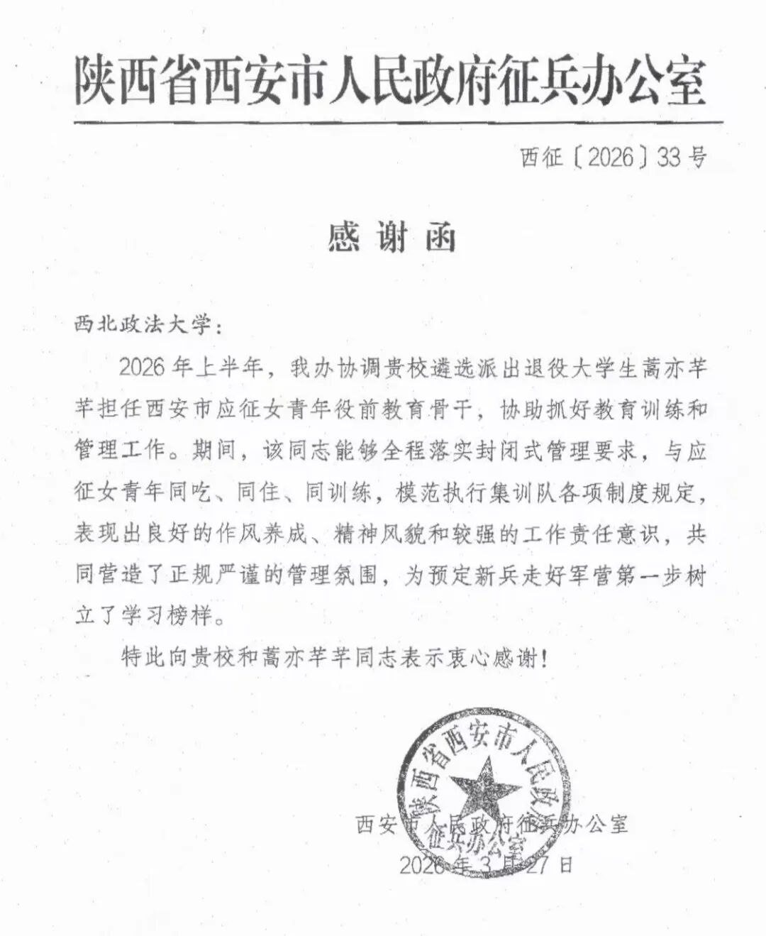 近日,西安市人民政府征兵办公室特向风车动漫 发来感谢信,对学校大力支持国防动员工作、选派优秀退役大学生蒿亦芊芊担任役前教育骨干表达诚挚感谢。