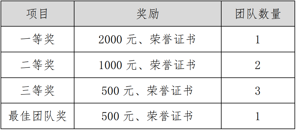 本次大赛共设一等奖一名,二等奖两名,三等奖三名,最佳团队奖一名,按等级颁发奖金及荣誉证书。