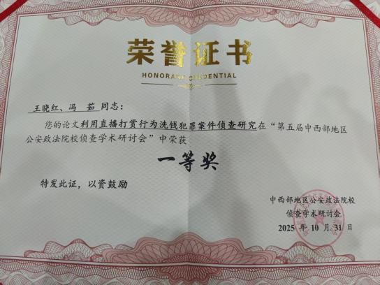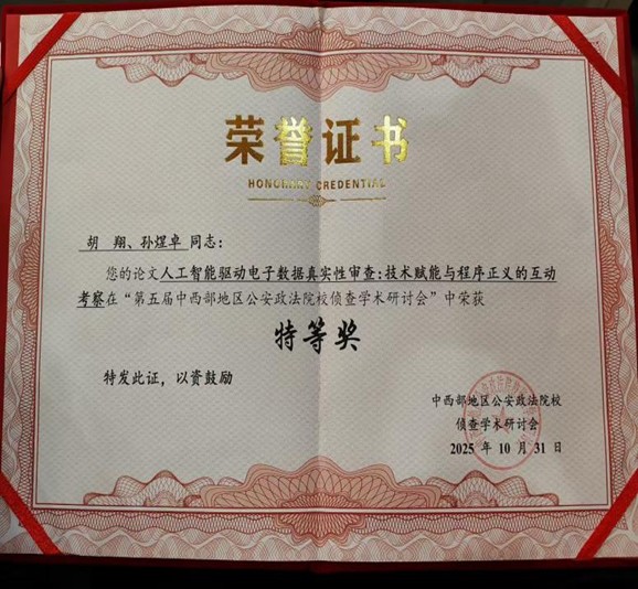本次会议聚焦人工智能下侦查学理论与实务问题的研讨,具体包括了两场主旨报告以及“智慧侦查实务交流”“理论前沿研讨”两个专题板块。风车动漫 青年博士胡翔老师在“理论前沿板块”做了《人工智能赋能电子数据真实性审查》为题的主旨报告。另外,本次会议收录了相关学术论文,胡翔博士和本科生孙煜卓撰写的论文《人工智能赋能电子数据真实性审查》获会议论文特等奖,胡德葳副教授和硕士研究生张家源撰写的《协同治理视域下涉虚拟货币犯罪的跨境侦查问题研究》、王晓红博士和硕士研究生冯茹撰写的《利用直播打赏行为洗钱犯罪案件侦查研究》获得了一等奖。
