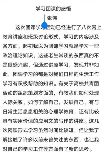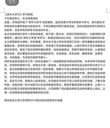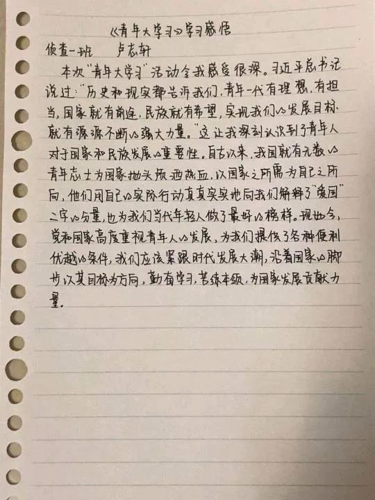 四.梦想从学习开始,事业从实践起步。学习,是广大青年托举梦想、成就梦想的“奠基石”。共青团是党领导的先进青年的群众组织,是党的助手和后备军。同学们高涨的学习热情告诉我们,青年大学习课堂不是完成任务,而是作为团员必须要有的必修课。不断的学习,激发了我们的创新意识和创新能力,磨练了我们的意志。我们坚信,在未来我们青年团员一定能承担起更多的责任。