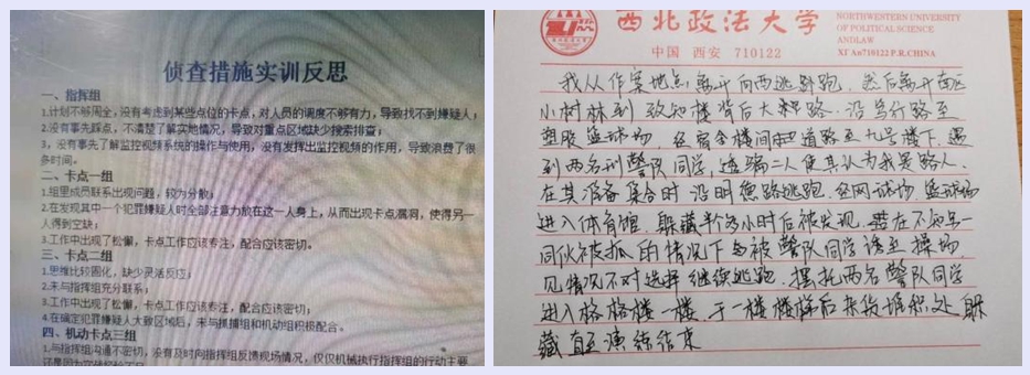 各班实训,设卡组都能够在5分钟内到达预定卡点,现场组能够查明“犯罪嫌疑人”数量、体貌特征,视频巡查能够发现嫌疑人去向;抓获第一名“犯罪嫌疑人”的最快时间为15分钟,最慢时间为40分钟;能够按法律规定完成人身搜查、公开辨认,制作《搜查笔录》、《辨认笔录》、《视频提取笔录》等文书。有些班级演练时,也出现了第二名“犯罪嫌疑人”逃出堵截范围等情况。