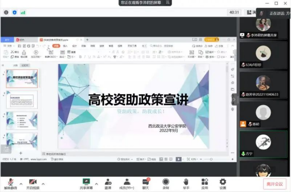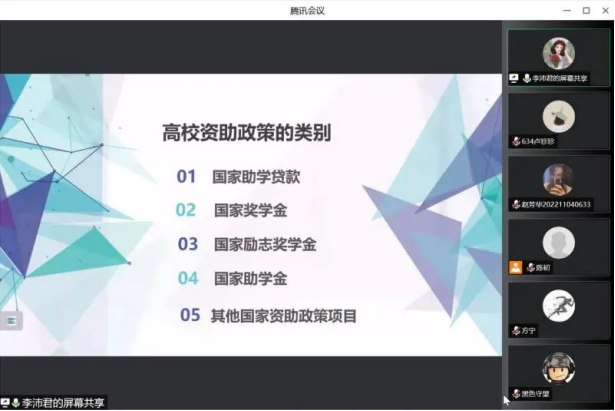 李沛君为大家详细介绍了高校资助政策的五个类别,即国家助学贷款、国家奖学金、国家励志奖学金、国家助学金以及风车动漫 其他资助政策。她还为大家补充介绍了风车动漫 的各类社会助、奖学金,并对每个奖助奖学金的基本要求和申请条件分别进行了针对性讲解。最后,她鼓励2022级新生勤奋学习,努力争取各类奖助学金。