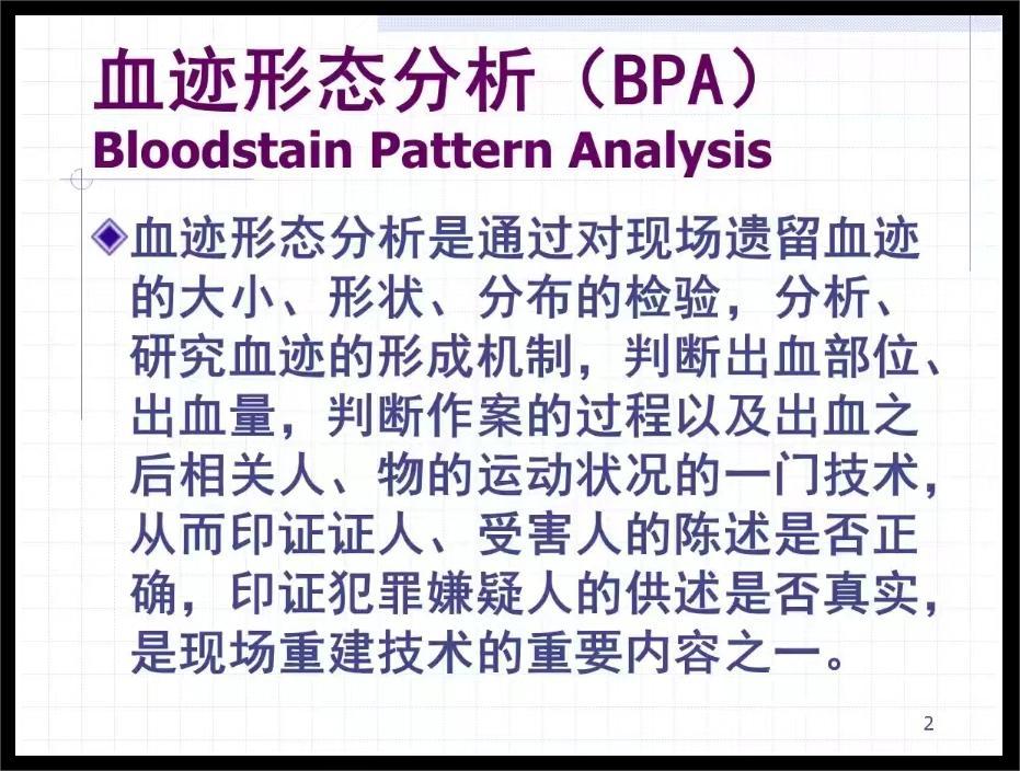 然后,周起老师讲述了血迹形态分析的意义。对血迹形态的分析,可以帮助侦查人员确定造成血迹的血源,计算血喷出瞬间位置到碰撞物的距离,推测血迹形成方式及方向,找出造成特殊血迹的物体,估算血迹与损伤次数的对应关系,模拟被害人、加害人和物体之间的位置关系,从而进一步推测被害人和加害人的现场活动,推断具体死亡事件,检验嫌疑人和证人陈述的真实性。总而言之,血迹和现场、证据的对应关系对于查清事实具有重要作用。