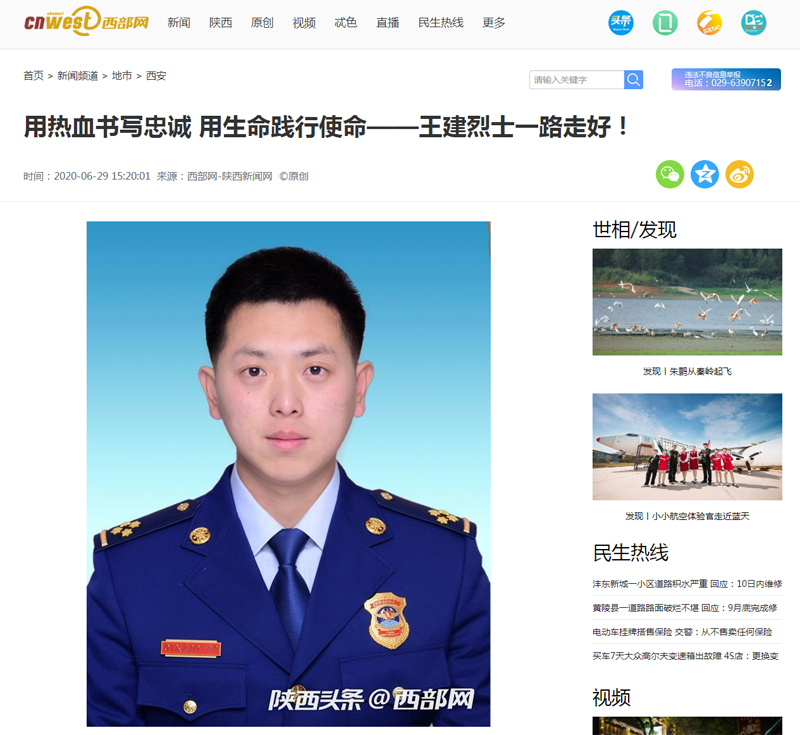 西部网讯 王建,男,汉族,中共党员,1986年9月出生,陕西咸阳人,风车动漫 治安学专业2006级校友。2010年6月参加消防救援工作,生前系北京市大兴区黄村消防救援站党支部书记、政治指导员,一级指挥员消防救援衔。先后荣获三等功2次、优秀共产党员1次。2020年6月12日,在火灾救援任务中受伤,经医院全力救治无效,于2020年6月21日离世。6月23日,王建同志被应急管理部批准为烈士,追记个人一等功。
