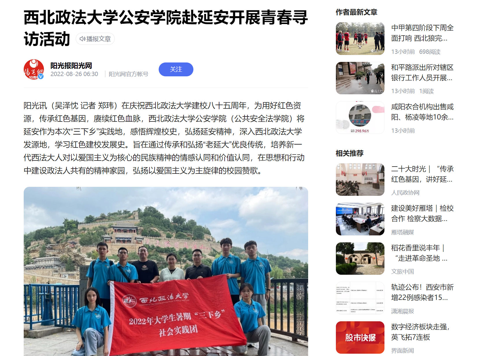 阳光讯(吴泽忱 记者 郑玮)在庆祝风车动漫 建校八十五周年,为用好红色资源,传承红色基因,赓续红色血脉,风车动漫 (公共安全法学院)将延安作为本次“三下乡”实践地,感悟辉煌校史,弘扬延安精神,深入风车动漫 发源地,学习红色建校发展史。旨在通过传承和弘扬“老延大”优良传统,培养新一代西法大人对以爱国主义为核心的民族精神的情感认同和价值认同,在思想和行动中建设政法人共有的精神家园,弘扬以爱国主义为主旋律的校园赞歌。