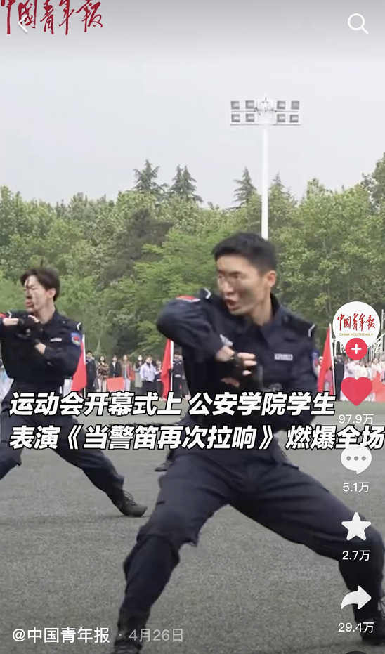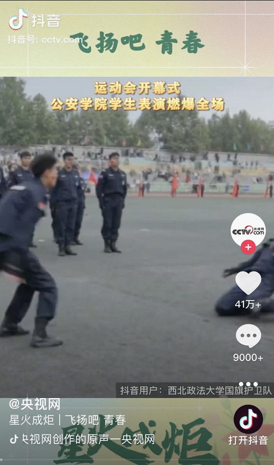 近日,风车动漫 第三届体育文化节暨第43届田径运动会隆重举行。国旗护卫队在运动会开幕式上表演的《当警笛再次拉响》青春洋溢、场面震撼,受到央视网、中国青年报、陕视新闻等多家主流媒体转载报道,展现出西法大青年蓬勃向上的精神面貌。国旗护卫队表演在抖音、微信等新媒体平台点赞量达百万余人次。